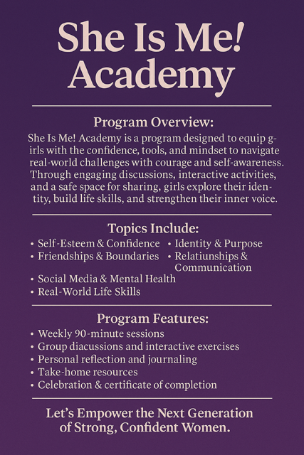 Through engaging discussions, interactive activities, mentorship opportunities, and practical tools, She Is Me Academy fosters a safe, supportive environment where young women can develop a strong sense of self-worth and navigate life with confidence.